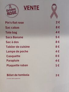Vente caritative : Pin’s flot rose, sac cabas, tote bag (sac en toile), sac banane, sac à dos, tablier de cuisine, lampe de poche, casquette parapluie, stickers